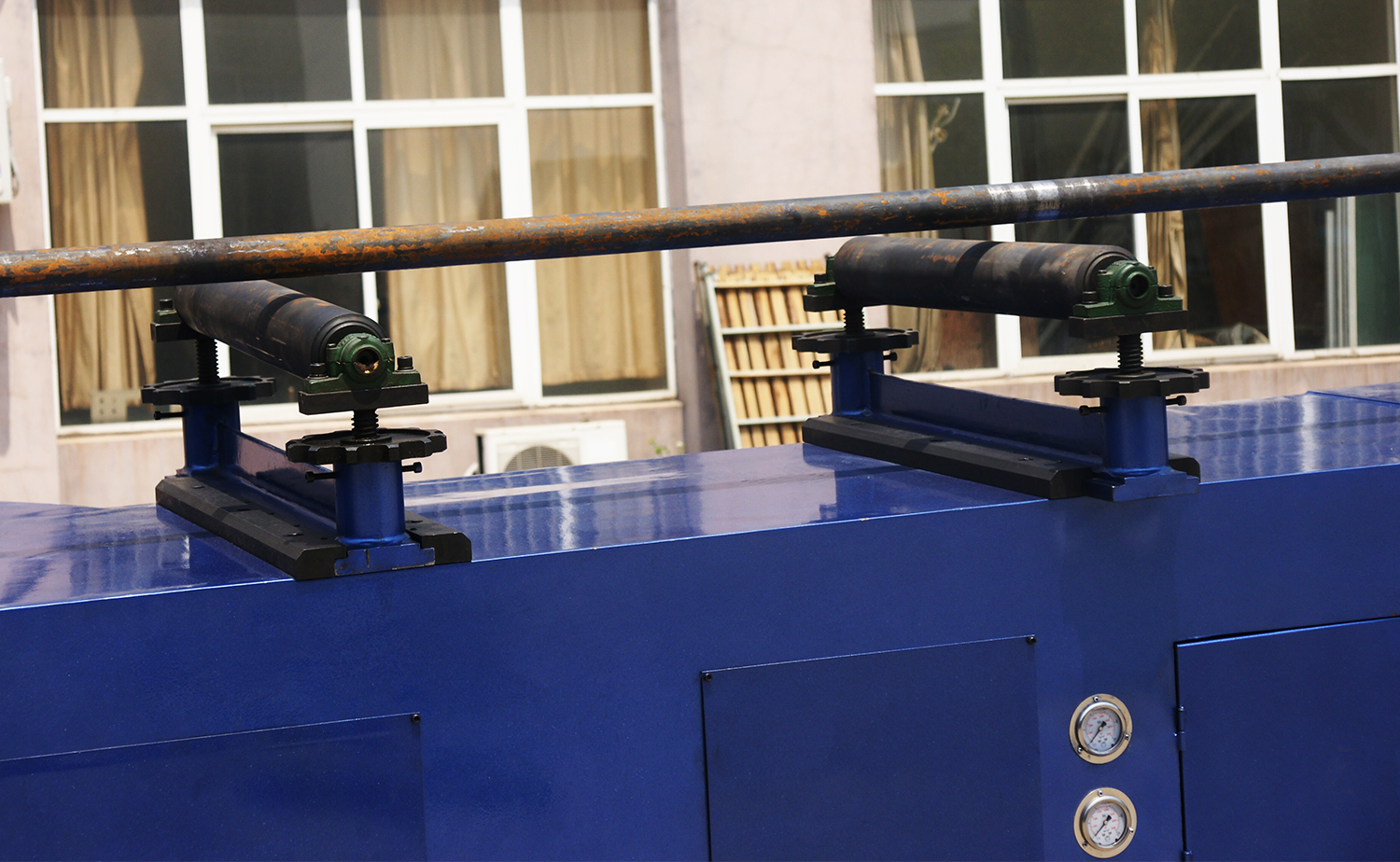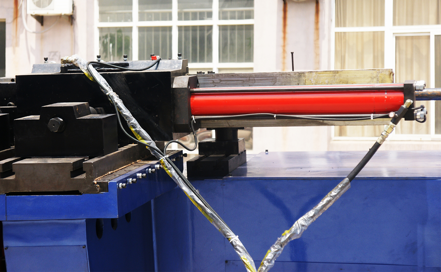 El eje de flexión es accionado por un cilindro, mientras que tanto el eje de alimentación como el de rotación son manuales para un control flexible y preciso.